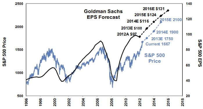 Goldman Sachs tõstab S&P 500 hinnasihti ja ootab, et indeks tõuseb käesoleval aastal veel 5% ning sulgub 1750 punktil. 2014. aastal on S&P 500 hinnasihiks 1900 punkti ning ülejärgmisel aastal 2100 punkti. Samas märgib Goldman, et kasumiootused jäid muutumatuks ning hinnasihi kasv tuleneb dividendide 30%-lisest kasvust perioodil 2013-2015, dividenditootluseks oodatakse 2%, mis on viimase 20 aasta keskmine tase. Ühtlasi oodatakse ettevaatava P/E kordaja kasvu 15 kordsele tasemele.