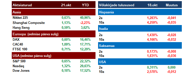 Euroopas on makrotasandil fookus ettevõtete oktoobrikuu kindlustunde indeksitel, millest olulisemad on Prantsusmaa INSEE (kolmapäev) ja Saksamaa IFO (reedel). Neljapäeval selguvad oktoobrikuu töötleva tööstuse ja teenindussektori esimesed küsitluste tulemused. Reede peale jääb ka Suurbritannia kolmanda kvartali SKP esmane näit.