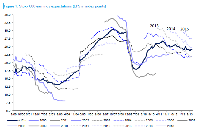 Euroopa ettevõtete kasumitsükkel kogu oma hiilguses via Deutsche Bank. Nagu näha, siis 2014 ja 2015.a EPSi prognoose on ka päris korralikult allapoole liigutatud oodatust nõrgema majandusliku väljavaate tõttu. Kui eurotsooni majanduse taastumine jätkub, siis on väga võimalik, et ühel hetkel muutuvad revideerimised positiivseks.