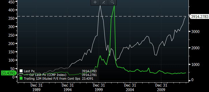Vaatasin, et Nasdaq indeksit jääb dot.com mulli ajal saavutatud tipust lahutama vaid ca 30% ja kuigi osade jaoks on praegunegi keskkond pisut juba aastatuhande vahetuse aega jälle meenutamas, siis 12 kuu tagasivaatava kasumi põhjal pole valuatsioon sellist hüpet kaasa teinud. Iseküsumus on see, kas 23x kasumit kaubelda on palju või vähe tehnoloogiasektori jaoks.