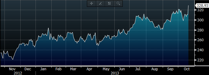 Internetikaubamaja Amazon.com aktsia rallis +5,8%, sulgudes uuel rekordtasemel 328,93 dollari juures. Tõusu põhjuseks oli UBSi poolt aktsia soovituse tõstmine “osta“ peale varasema „hoia“ pealt, kuna analüüsimaja prognoosib ettevõtte käibe kasvu kiirenemist neljandas kvartalis. Amazoni aktsia viimase 12-kuu graafik: