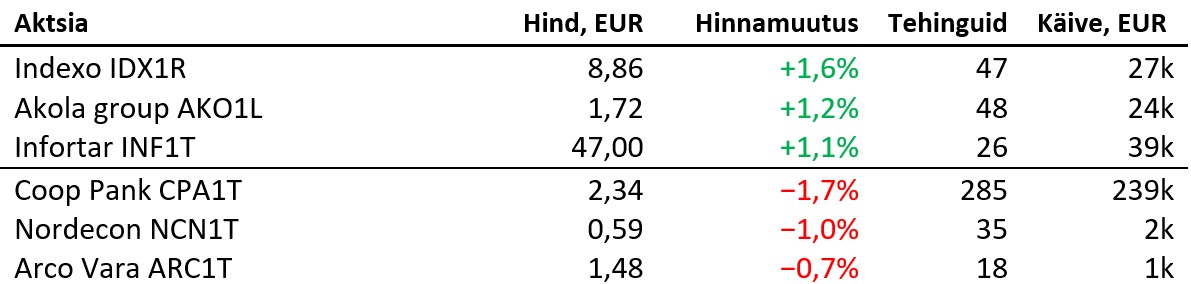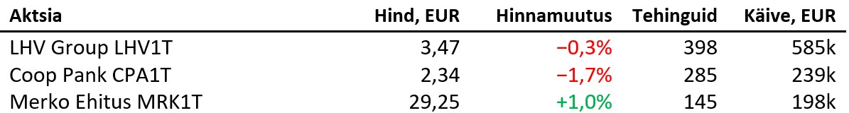 Balti põhinimekirjas tehti kolmapäeval 2769 tehingut ning käive oli 1,855 miljonit eurot, millest Tallinna börsi käive moodustas 1,450 miljonit eurot ning Vilniuse börsi käive 349 tuhat eurot. Tehinguid tehti vastavalt 1652 ning 900.