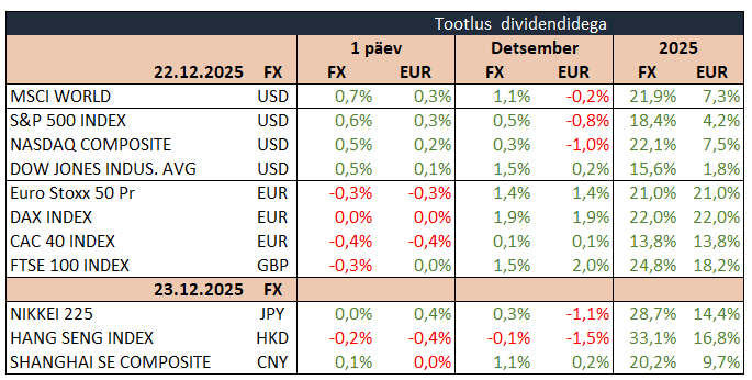 Makropildi poolelt jätkasid turuosalised hiljutiste USA tööturuandmete seedimist, mis viitasid aeglasemale värbamisele ja töötuse määra tõusule 4,6% tasemele. See on tugevdanud ootusi, et Föderaalreserv võib jätkata intressimäärade langetamist järgmisel aastal. Kauplemisaktiivsus jäi siiski tagasihoidlikuks, kuna pühade eel on turul tavapärasest vähem osalejaid.