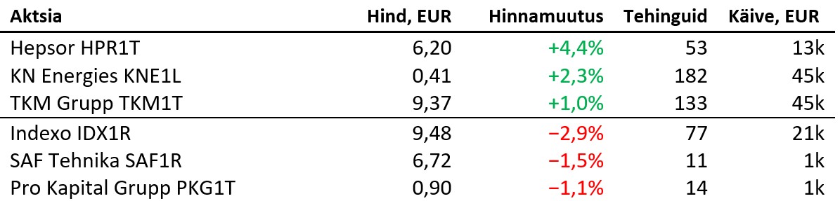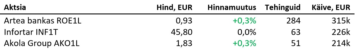 Balti põhinimekirjas tehti esmaspäeval 2807 tehingut ning käive oli 1,993 miljonit eurot, millest Tallinna börsi käive moodustas 932 tuhat eurot ning Vilniuse börsi käive 917 tuhat eurot.Tehinguid tehti vastavalt 1644 ning 951.