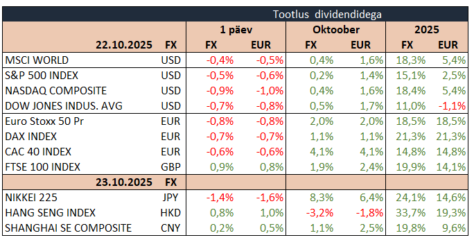 Aasia aktsiaturud kauplesid öösel erisuunaliselt, kerkides Hongkongis 0,4% ja Austraalias 0,1%, kuid langedes Jaapanis 1,4%, Hiinas 0,1% ja Lõuna-Koreas 0,8%. Brenti toornafta kallines 3,6% 64,8 dollarile, Bitcoin tõusis 1,7% 110 028 dollarile ning Ethereum kerkis 0,3%, kaubeldes 3879 dollaril. EUR/USD nõrgenes 0,1% 1,1594 dollarile ja unts kulda maksis 4120 dollarit, kallinedes 1,7%.