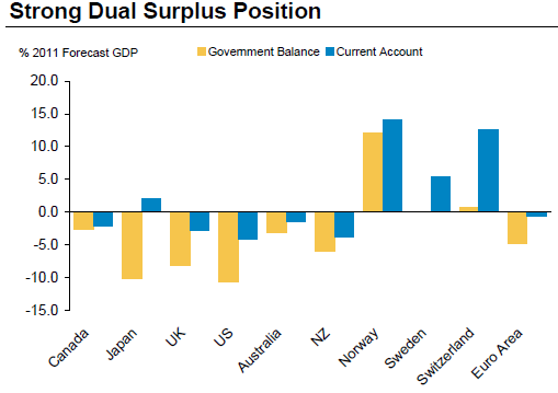 Ka Norra puhul liigub 40% ekspordist eurotsooni, kuid peamine erinevus on selle sisu, sest Norra ekspordib peamiselt naftat ja maagaasi. Seega on oma roll lisaks mängida toorainete turuhindadel, kuid kuna ligi 80% energia nõudluse kasvust tuleb järgmisel aastal arenevatest riikidest ja kui sealne majanduskasv palju järgi ei anna, siis see peaks toorainehindasid toetama. Ja nagu allolevalt jooniselt võib näha, siis Norra saab uhkeldada suure kaubandusbilansi ülejäägiga ning G10 riikidest kõige tugevaima eelarve ülejäägiga. Majanduslikult keerulisemas olukorras ei pea Norra hakkama väljastpoolt laenama, kuna vajadusel võidakse kulutusi katta massiivse naftafondi tuludega. Kuna arenenud riigid on olukorras, kus intressimäärasid tuleks hoida jätkuvalt nulli lähedal või eurotsooni puhul jälle langetada, siis see peaks vastavaid valuutasid Norra krooni suhtes nõrgestama. MS ei oota Norra keskpangalt lähiajal intresside kärpimist, kuid survestav tegur võib siiski olla toorainete hinnad. Oma baasstsenaariumis on nad NOKi suhtes konstruktiivsed ning ootavad järgmise aasta esimeseks kvartaliks euro nõrgenemist Norra krooni suhtes tasemele 7,55 NOK vs 7,82 NOK eilse sulgumisega.