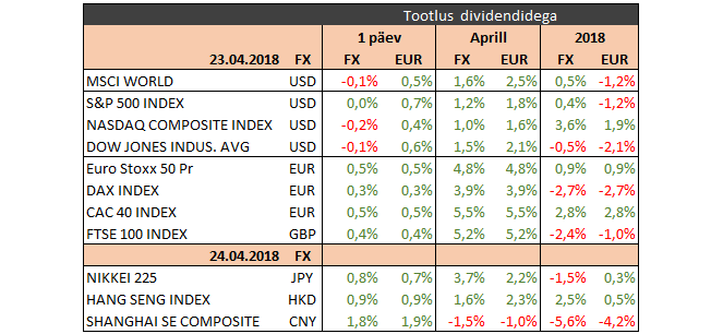 Tänastest majandusuudistest võiks esile tõsta Prantsusmaa ja Saksamaa ettevõtete aprilli kindlustunde indekseid, USA uute majade märtsi müügi ning tarbijate kindlustunde aprilli muutuse. Ettevõtetest avaldavad oma tulemused teiste seas 3M, Caterpillar, Coca-Cola, Eli Lilly, Lockheed Martin, Verizon.