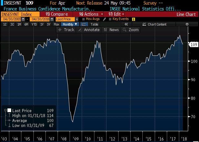 Prantsusmaa töötleva tööstuse ettevõtete kindlustunde indeks alanes aprillis -1 punkti võrra 109 punktile, jäädes alla analüütikute 110punktisele ootusele