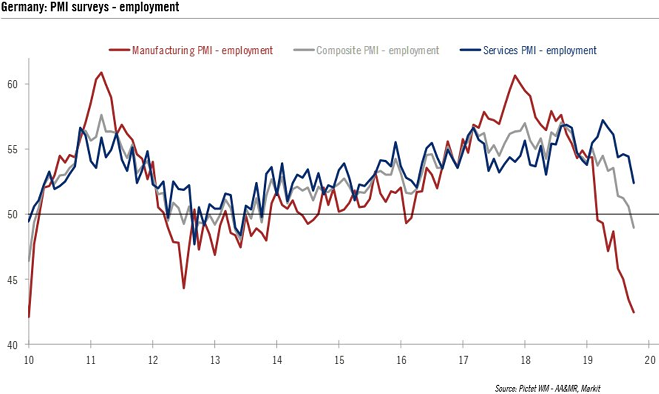 Markit: The manufacturing downturn remains the fiercest since 2012, and continues to infect the service sector, where October saw the smallest increase in new work for almost five years.