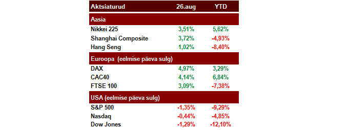 Sentimenti aitas Euroopas parandada Saksamaa ettevõtete kindlustunde indeks, mis vastupidiselt oodatud 0,4punktisele langusele kerkis augustis 0,3 punkti 108,3 punkti peale ning jõudis sellega kõrgeimale tasemele alates maist. Samuti mõjusid lohutavalt Euroopa Keskpanga asepresidendi Vitor Constancio kommentaarid, mille raames ütles, et hinnastabiilsuse väljavaade pole tema arvates palju muutunud ning tuletas samas meelde, et vajadusel võidakse kasutada kõiki keskpanga käsutuses olevaid vahendeid.