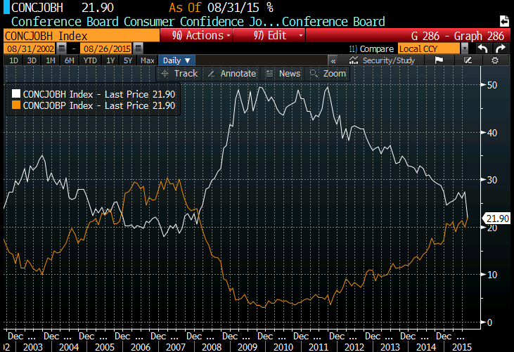 USA tarbijate kindlustunde indeks on küll olnud viimase kahe kuu jooksul ebatavaliselt volatiilne ning usaldusväärsuse kohalt pole see hea, kuid kui antud teemast mööda vaadata, siis küsitluse raames kukkus augustis nende inimeste arvu osakaal tsükli madalaimale tasemele, kelle arvates on töökohad raskesti käätesaadavad (21.9% vs 27,4% juulis) ja nende osakaal, kelle arvates on töökohtasid piisavalt, kerkis tsükli tippu (19,9% pealt 21,9%le). Kokkuvõttes annab see USA tööturu kohta positiivse signaali.