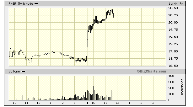 FNSR oli täna väga kena, aga paraku aktsia enam eelturu tasemetest soodsamat hinnataset ei pakkunud. Aktsia avanes $ 19,41 pealt ehk 4% ülevalt ja on alates avanemisest stabiilselt ülespoole liikunud. FNSR kaupleb hetkel $ 20,40 kandis, 9,2% plusspoolel.