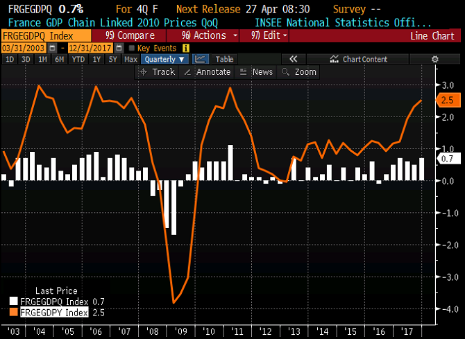 Prantsusmaa majanduse neljanda kvartali SKP kvartaalne kasv revideeriti 0,1pp võrra kõrgemaks 0,7%le, mullusega võrreldes jäi aga kasvumtepo 2,5%peale. Kiire majanduskasv tähendas ühtlasi seda, et tänu maksutulude tõusule oli valitsuse eelarve defitsiit mullu arvatust märksa parem ehk -2,6% - esimest korda viimase 10a jooksul alla -3%.