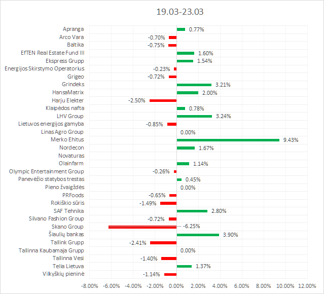 Reedel tõusid vaid HansaMatrix (+2.00%, käive EUR 400), EfTEN Real Estate Fund III (+0.63%, käive EUR 2k), Grindeks (+0.26%, käive EUR 19k). Suurimad langejad olid Novaturas (-3.55%, käive EUR 14k), SAF Tehnika (-2.65%, käive EUR 17k), Ekspress Grupp (-1.49%, käive EUR 24k).