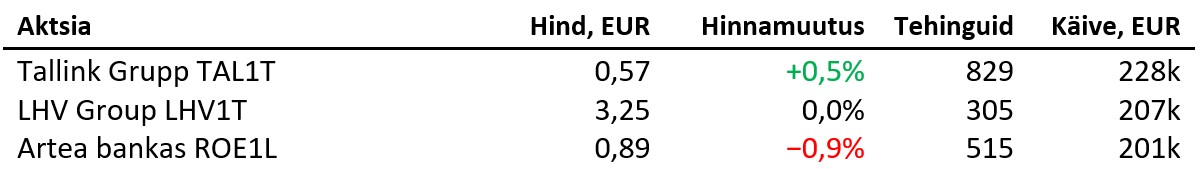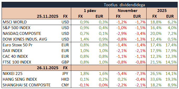 Aasia aktsiaturgudel valitses positiivne meeleolu: Nikkei tõusis 1,9%, ASX 200 0,8%, Kospi 2,7% ja Hang Seng 0,1%. Shangai Composite langes 0,2%. Brenti toornafta odavnes 0,1% 61,4 dollarile, Bitcoin kallines 0,1% 87 539 dollarile ning Ethereum kerkis 0,9%, jõudes 2929 dollarile. EUR/USD tugevnes 0,1% 1,1577 dollarile ja unts kulda maksis 4166 dollarit (+0,6%).