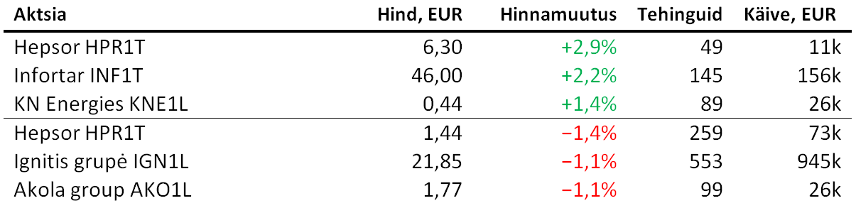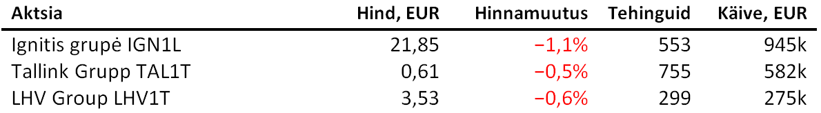 Balti põhinimekirjas tehti kolmapäeval 3459 tehingut ning käive oli 2,632 miljonit eurot, millest Tallinna börsi käive moodustas 1,448 miljonit eurot ning Vilniuse börsi käive 1,163 miljonit eurot. Tehinguid tehti vastavalt 2215 ning 1149.