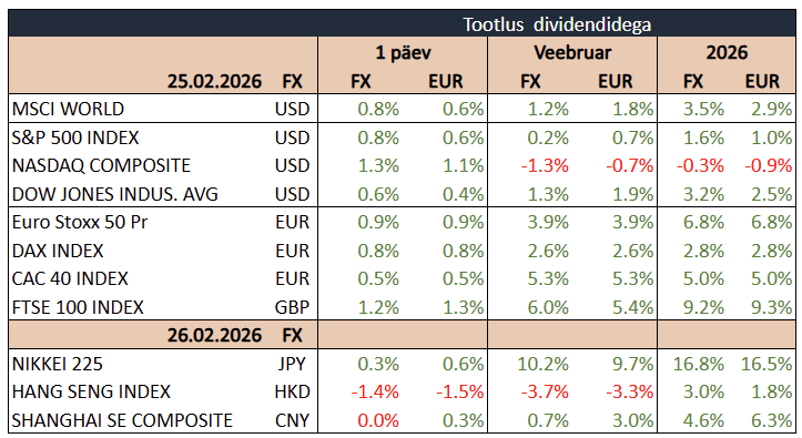 Makropildis püsis tähelepanu Föderaalreservi edasistel sammudel ning rahvusvahelisel taustal jätkuval 10% üleilmsel imporditollil, kuigi president Trumpi hiljutine kõne keskendus enam sisepoliitilistele teemadele. Turud liiguvad nüüd edasi järgmiste suurettevõtete tulemuste ning uute majandusandmete ootuses, mis annavad täpsemaid vihjeid nii intressipoliitika kui ka ettevõtete kasumiväljavaadete osas.