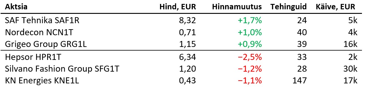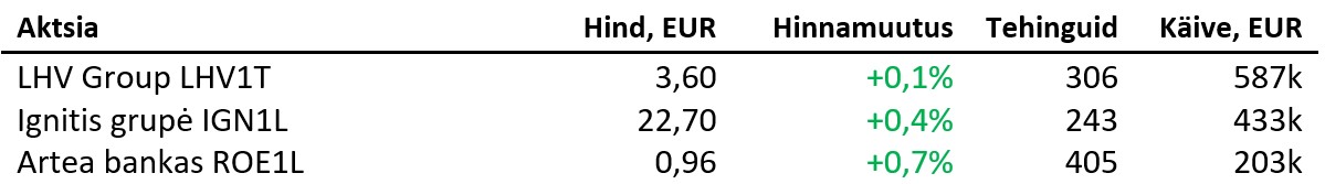 Balti põhinimekirjas tehti esmaspäeval 2785 tehingut ning käive oli 2,033 miljonit eurot, millest Tallinna börsi käive moodustas 1,095 miljonit eurot ning Vilniuse börsi käive 860 tuhat eurot. Tehinguid tehti vastavalt 1506 ning 1082.
