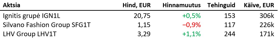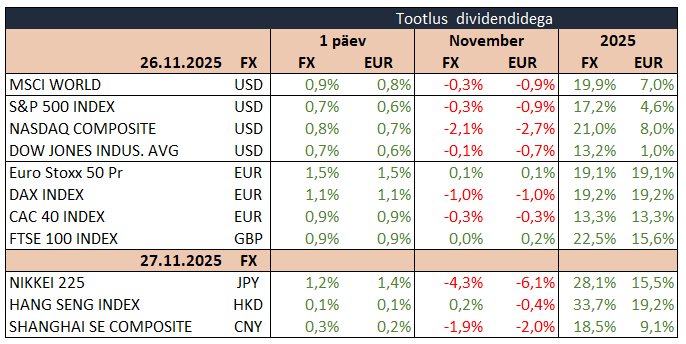 Aasia aktsiaturgudel valitses positiivne meeleolu: Nikkei tõusis 1,2%, ASX 200 0,1%, Kospi 0,7%, Hang Seng 0,1% ja Shangai Composite 0,3%. Brenti toornafta odavnes 0,1% 62,5 dollarile, Bitcoin kallines 4,2% 91 273 dollarile ning Ethereum kerkis 3,1%, jõudes 3023 dollarile. EUR/USD nõrgenes 0,1% 1,1588 dollarile ja unts kulda maksis 4163 dollarit (−0,1%).