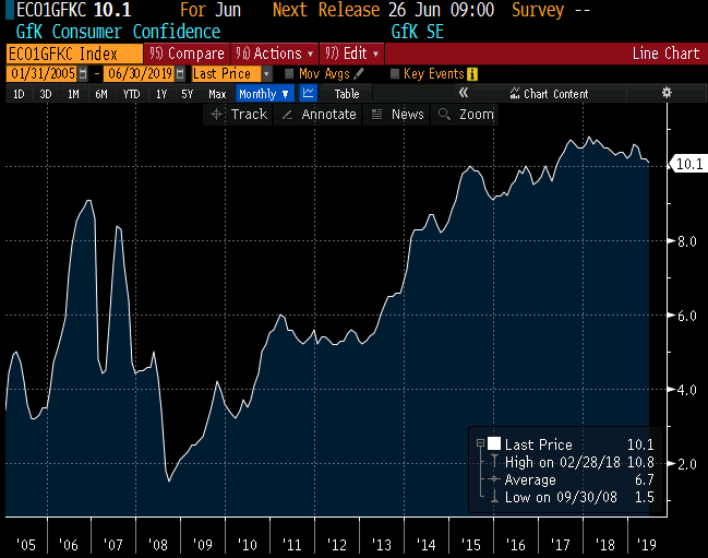 Saksamaa tarbijate kindlustunde indeks on juunis alanemas 0,1 punkti võrra 10,1 punktile, mis jäi alla analüütikute oodatud 10,4 punkti (mai revideeriti 0,2 punkti madalamaks 10,2 punktile).