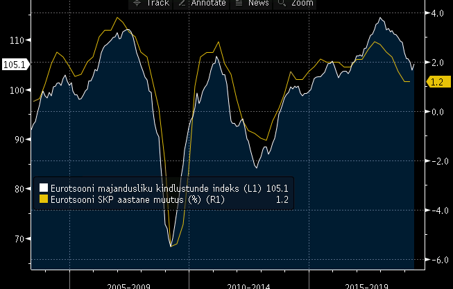 Eurotsooni majandusliku kindlustunde indeks paranes mais 1,2 punkti 105,1 punktile, ületades analüütikute 104,0punktist prognoosi ning andes lootust, et euroala majanduskasv on pärast aasta väldanud aeglustumist stabiliseerumas