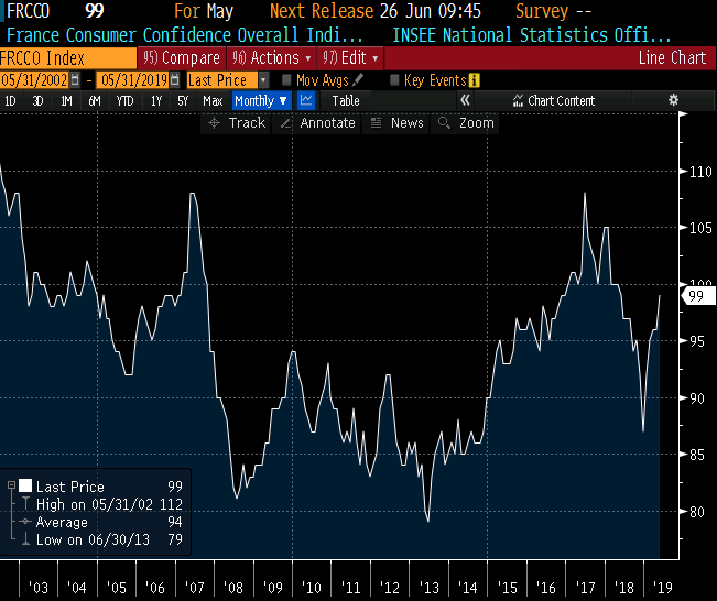Prantsusmaa tarbijate kindlustunne üllatas seevastu positiivselt, kerkides mais kolme punkti võrra 99 punktile ning ületades analüütikute 97punktist prognoosi