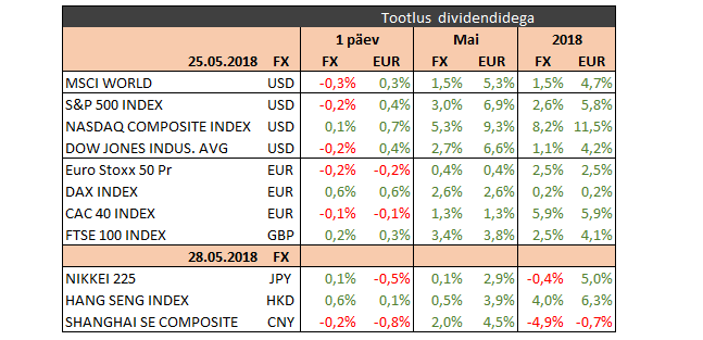 Ühendriikide aktsiaturu indeksid jäid pikema nädalavatuse eel tagasihoidliku käibe juures valdavalt punasesse (S&P 500 -0,2%), andes ära osa nädala võidust (S&P 500 0,3%). Nasdaq kerkis teistest indeksitest esile, saavutades viie tööpäeva lõikes 1,1% tootluse. Dollar lõpetas kolmandat nädalat kõrgemal, mis oli pikim võiduseeria rohkem kui kolme aasta jooksul ning tähendas EUR/USDi puhul sulgumist 1,1651 dollaril. Toornafta langus ja poliitiline risk survestasid Euroopa aktsiaid, seda eeskätt Itaalias, mille börsiindeks kukkus nädalaga -4,5%.
