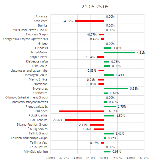 Suurimad tõusjad olid Baltika (+3.54%, käive EUR 5k), LHV Group (+1.36%, käive EUR 62k), Novaturas (+0.80%, käive EUR 11k). Suurimad langejad olid Olympic Entertainment Group (-1.81%, käive EUR 41k), Nordecon (-1.64%, käive EUR 24k), Rokiškio sūris (-1.46%, käive EUR 5k).