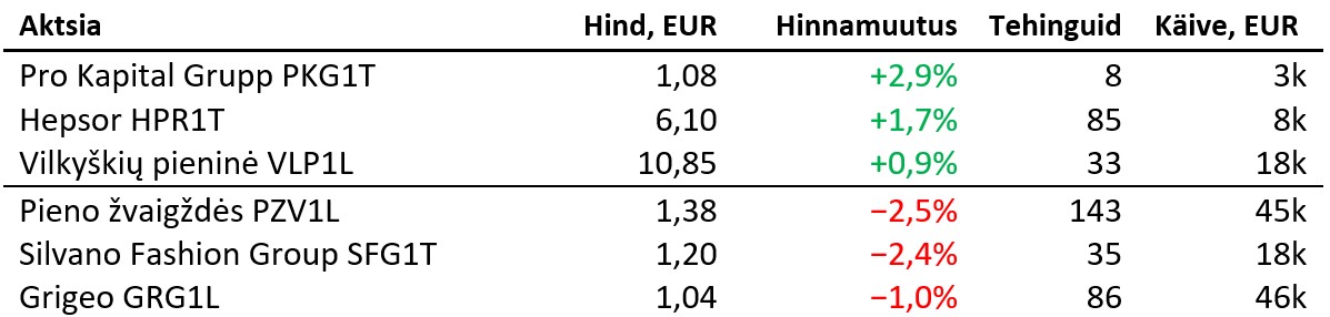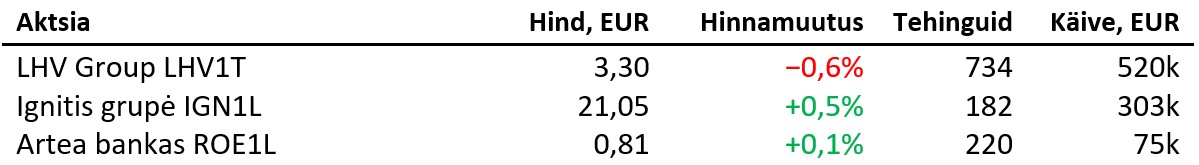 Balti põhinimekirjas tehti esmaspäeval 2938 tehingut ning käive oli 1,468 miljonit eurot, millest Tallinna börsi käive moodustas 875 tuhat eurot ning Vilniuse börsi käive 571 tuhat eurot. Tehinguid tehti vastavalt 1937 ning 896.