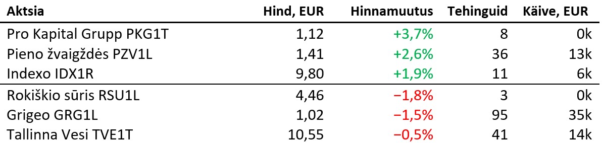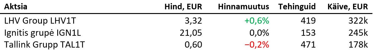 Balti põhinimekirjas tehti teisipäeval 2743 tehingut ning käive oli 1,412 miljonit eurot, millest Tallinna börsi käive moodustas 857 tuhat eurot ning Vilniuse börsi käive 531 tuhat eurot. Tehinguid tehti vastavalt 1845 ning 758.
