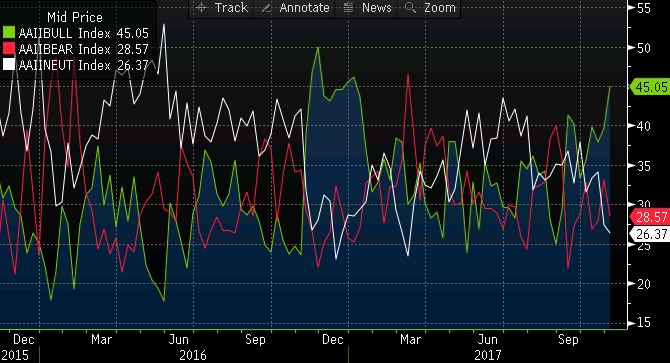 Viimase nädalaga on ka USA väikeinvestorid muutunud üsna optimislikuks, kui pullide osakaal kerkis 39,6% pealt 45,1%le ja pessimistide osakaal langes 33%lt 28,6%le. Järgmise kuue kuu osas neutraalse hoiakuga investorite osakaal alanes 27,3%lt 26,4%le.