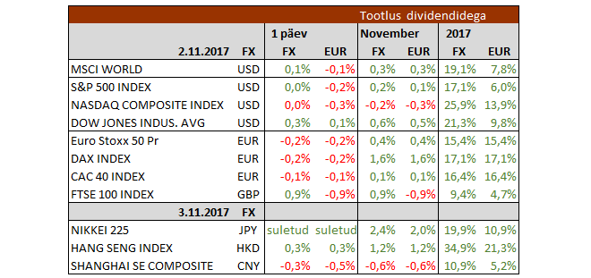 Jerome Powelli nimetamine FEDi järgmiseks presidendiks ning USA maksueelnõu avalikustamine esindajatekoja vabariiklaste poolt ei tekitanud eile turgudel elevust, kuna esimene oli oodatud uudis ning maksuplaan vajab veel arutelu ning kompromisside tegemist, enne kui see seadusesse kirjutatakse. Nii S&P 500 kui ka Nasdaq jäid eelneva päeva sulgumistaseme juurde. Dow Jones kerkis tööstus- ja finantssektori ettevõtete eestvedamisel 0,4% uue rekordini. Euroopas lõpetas Stoxx 600 -0,5% madalamal.
