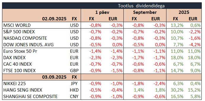 USA aktsiaturud alustasid septembrit languses, kui turuosaliste meeleolu jahenes keset kasvavat ebakindlust kaubanduspoliitika, intressimäärade ja majandusandmete osas. S&P 500 langes 0,7% ja Nasdaq 100 0,9%, mis märkis tehnoloogiaindeksile juba teist järjestikust languspäeva. Langusele aitasid kaasa tõusvad riigivõlakirjade tootlused, kus 10-aastase võlakirja tulusus kerkis 4,3% lähedale ja 30-aastane tootlus jõudis 5% piirimaile, vähendades sellega riskiisu aktsiates.