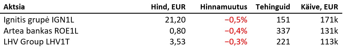 Aasia aktsiaturud liikusid kolmapäeva öösel valdavalt miinuspoolel, kui Nikkei langes 1,0%, ASX200 1,8%, Shangai Composite 1,0% ja Hang Seng 0,5%, samas kui Kospi kerkis 0,3%. Jaapanis jäi fookusesse keskpanga valmisolek intressitõusuks ja poliitiline ebakindlus seoses peaminister Ishiba võimaliku tagasiastumisega. Hiina erasektori aktiivsusnäitaja kerkis 9 kuu kõrgeimale tasemele, kuid kinnisvarasektor survestas turgu. Brenti toornafta odavnes 0,3% 68,4 dollarile, Bitcoin tõusis 0,3% 110 833 dollarini, Ethereum langes 2,1% tasemele 4315 dollarit, EUR/USD püsis 1,1642 juures ja kulla hind tõusis 0,2%, jõudes 3536 dollarini untsist.