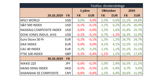 Täna selguvad Prantsusmaa ja USA SKP kolmanda kvartali muutused ning lõppeb FOMC kahepäevane istung, mille raames oodatakse intressimäära kärpimist sel aastal kolmandat korda 25 baaspunkti võrra vahemikule 1,5-1,75%le.