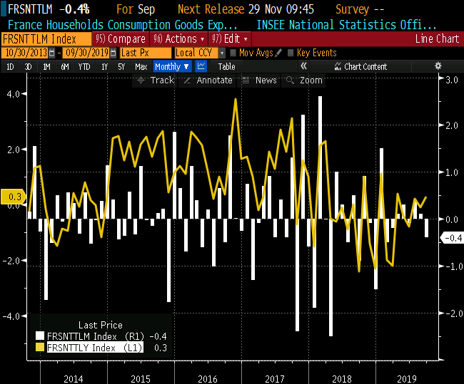 Kvartali lõpp kujunes majapidamiste tarbimise osas Prantsusmaal arvatust nõrgemaks: kulutused kahanesid 0,4% võrreldes augustiga (oodati 0,0%) ning aasta baasil pöördus 0,1% langus 0,3% kasvuks, ent loodeti siiski näha 0,6% tõusu.