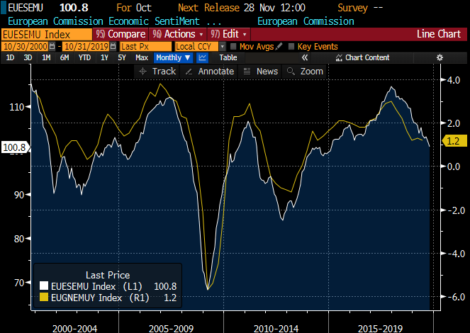 Euroala majandusliku kindlustunde indeks alanes oktoobris 0,9 punkti 100,8 punktile, mis viitab sellele, et majanduses pole veel põhja saavutatud.