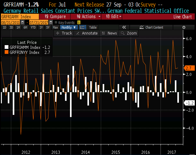Saksamaa jaemüük, mis on üsna volatiilne näitaja, vähenes juulis MoM -1,2% (oodati -0,6%) ning kasv aastatagusega võrreldes aeglustus 2,7%le (oodati 2,9%)