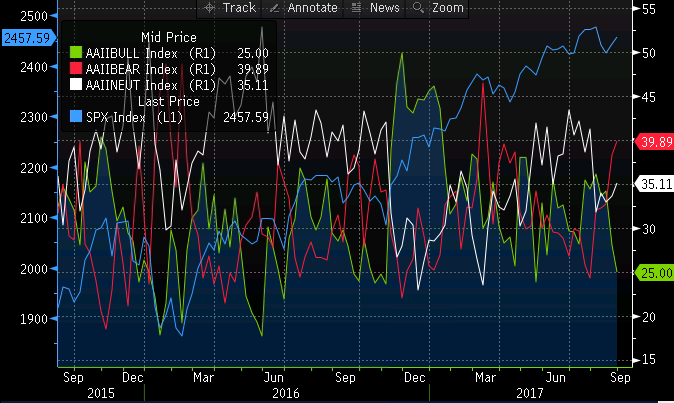 USA väikeinvestorite sentiment on muutunud suhteselt negatiisveks, mis pigem peaks rääkima aktsiaturu tõusu kasuks. Pullide osakaal kahanes täna lõppenud nädalal 28,1% pealt 25,0%le, karude osakaal kerkis 38,3% pealt 39,9%le ja neutraalse nägemusega investorite osakaal tõusis 33,6%lt 35,1%le.