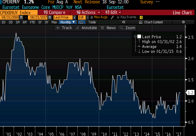 Eurotsooni inflatsioon osutus augustis oodatust veidi kiiremaks (1,5% vs prog 1,4%) aga kütust ja toitu arvestamata püsis vastavalt prognoosile 1,2% peal