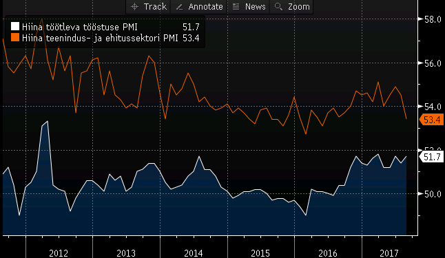 Öösel avaldatud Hiina PMI indeksid näitasid, et riigi tööstussektori kasv püsib tugevana, kui ametlik aktiivsusindeks kerkis oodatud -0,1punktise languse asemel 0,3 punkti 51,7 punktile. Uute tellimuste indeks tõusis 52,8 punktilt 53,1 punktile, kuid eksporditellimuste indeksi langus 50,9 punktilt 50,4 punktile näitab, et nõudluse kasv tuleb peamiselt koduturult. Väljaspool töötlevat tööstust aeglustus aktiivsus augustis -1,1 punkti võrra 53,4 punktile aga siin avaldab mõju ehitussektor, kus PMI alanes 62,5 punktilt 58 punktile.