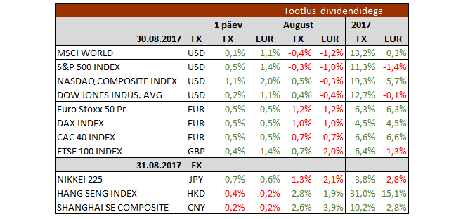 Ühendriikide teise kvartali annualiseeritud kasv revideeriti 2,6% pealt 3,0% peale tänu sellele, et tarbijate kulutused osutusid märksa suuremaks (2,8% asemel 3,3%) ja samuti korrigeeriti positiivsemaks ettevõtete investeeringuid, mis näitasid tugevat annualiseeritud kasvu teist kvartalit järjest (6,9% vs 7,2% esimeses kvartalis). Aastatagusega võrreldes kasvas USA majandus 2,2%, jätkates kiirenemist pärast 2016.a neljandas kvartalis saavutatud 1,8% kasvu ning esimese kvartali 2,0% tõusu.