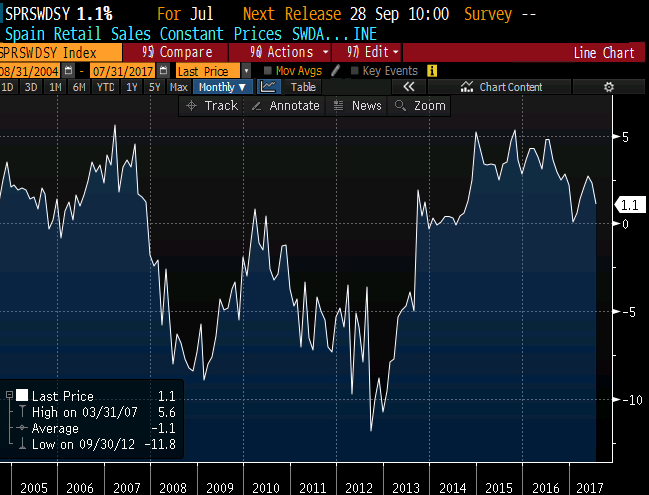 Hispaania jaemüügi kasv aeglustus juulis 2,3%lt 1,1%le, mis oli nõrgem kui oodatud 2,5%