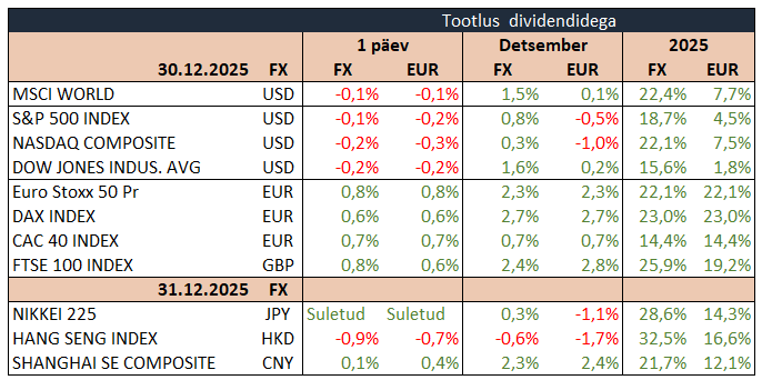 Laiemas plaanis kinnitab aasta lõpu lähedal toimuv rahulik kauplemine, et investorid eelistavad positsioone hoida, hinnates samal ajal 2026. aasta vaadet. Aktsiaturud on teel kolmandat aastat järjest üle 15% suuruse aastase tootluse suunas.