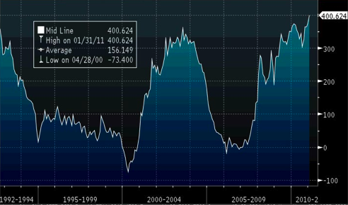 Zerohedge.com avaldas taaskord huvitavaid uudised võlakirjaturult – 2s30s ehk teisisõnu 2-aastase ja 30-aastase USA riiklike võlakirjade spread moodustas täna kõikide aegade tipu ehk 400.6 protsendipunkti. Taaskord tuleb tunnistada, et QE2 ei ole just kõike õnnestunum programm, kuna Fedi esmärgiks peaks olema eelkõige pikaajalise laenumäära alandamine (kinnisvaraturu upitamine). Nii mõnedki USA investeerimispankurid, kellega olen seda teemat hiljuti arutanud on kindlal arvamusel, et kevadel tuleb uus QE just hüpoteeklaenu intressimäära alandamiseks ning hääbuva kinnisvaraturu elavdamiseks. Senikaua võib aga kasutada sama strateegiat - müüa 30-aastast võlakirja lühikeseks ja osta sama summa eest lühiajalisi võlakirju.