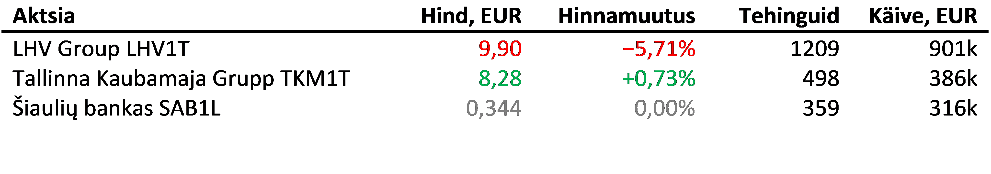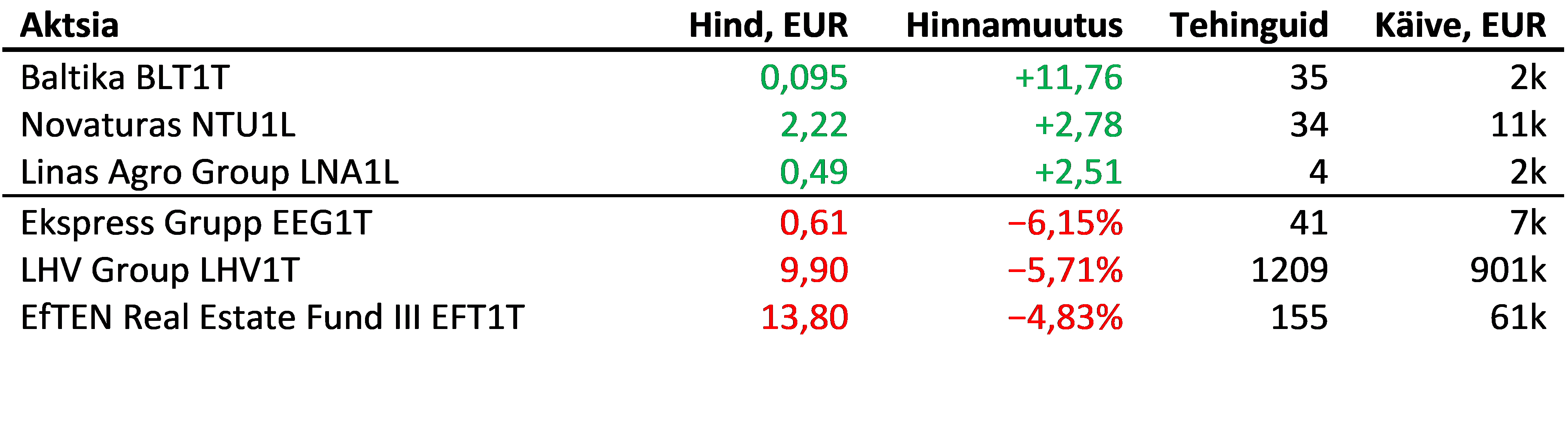 Balti põhinimekirjas tehti esmaspäeval 4334 tehingut ning käive oli 2663 tuhat eurot, millest Tallinna börsi käive moodustas 2108 tuhat eurot ning Vilniuse börsi käive 534 tuhat eurot. Tehinguid tehti vastavalt 3555 ning 725.