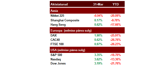 Kuigi majandusuudised Euroopas ja Ameerikas ei näita tõenäoliselt veel niipea võimalikku pööret paremuse suunas, loodetakse aktsiaturgudel kiirele taastumisele ning selle ootus on tõenäoliselt pannud osasid mõtlema, kas on oht rongist maha jääda, kui kohe peale ei hüppa. S&P 500 lõpetas esmaspäeval 3,4% tõusuga sessiooni tipus, Euroopas sulgus Stoxx 600 1,3% plusspoolel. Müügisurve jätkus aga naftaturul, kus WTI barreli hind langes 7,4% 19,9 dollarile ja Brent odavnes üle 10% 22,3 dollarile.