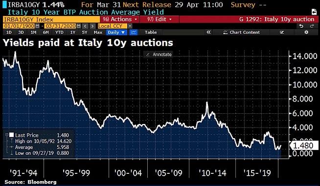Euroala valitsustel ei näi võlakirjade müügiga praegu probleeme olevat: Itaalia müüs 1,5 miljardi euro eest 2030.a võlga 1,44% yieldiga, nõudlus oli 2,29 miljardit eurot