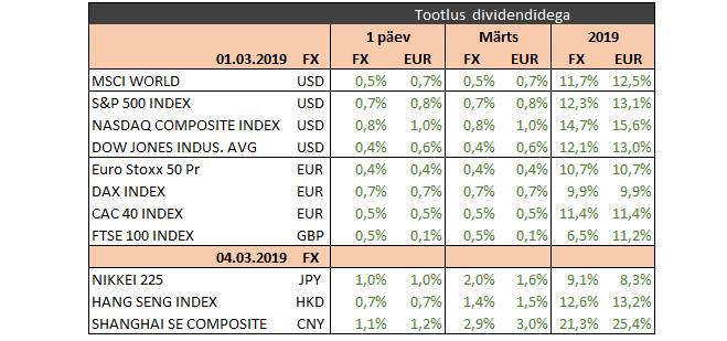 Oodatust negatiivsemaks osutunud USA konjunktuur ei suutnud reedel ehmatada turuosalisi, kelle tähelepanu on praegusel ajal rohkem fikseeritud progressile kaubanduspingete leevenemises ning FEDi lõdvemale rahapoliitilisele hoiakule. S&P 500 indeks kosus reedel 0,7%, pannes nädalale punkti 0,4% võiduga (eurodes 0,2%). Euroopas suundus Stoxx 600 reedel 0,4% kõrgemale ning parandas viie päeva lõikes taset 0,8%.