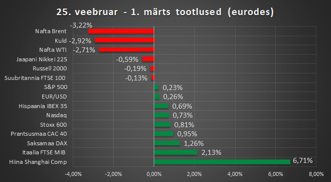 Olulisi majandusuudiseid jagub tänasesse päeva üsna vähe, küll aga toob käesolev nädal mitmeid tähtsaid sündmusi. Homme algaval Hiina poliitilisel kongressil seab valitsus oma järgneva aasta eesmärgid, sh ootuse majanduskasvule ning paneb paika poliitilise tegevuskava. Neljapäeval langetab Euroopa Keskpank intressimäära otsuse ning Ühendriikides avaldatakse reedel veebruarikuu tööturu raport.